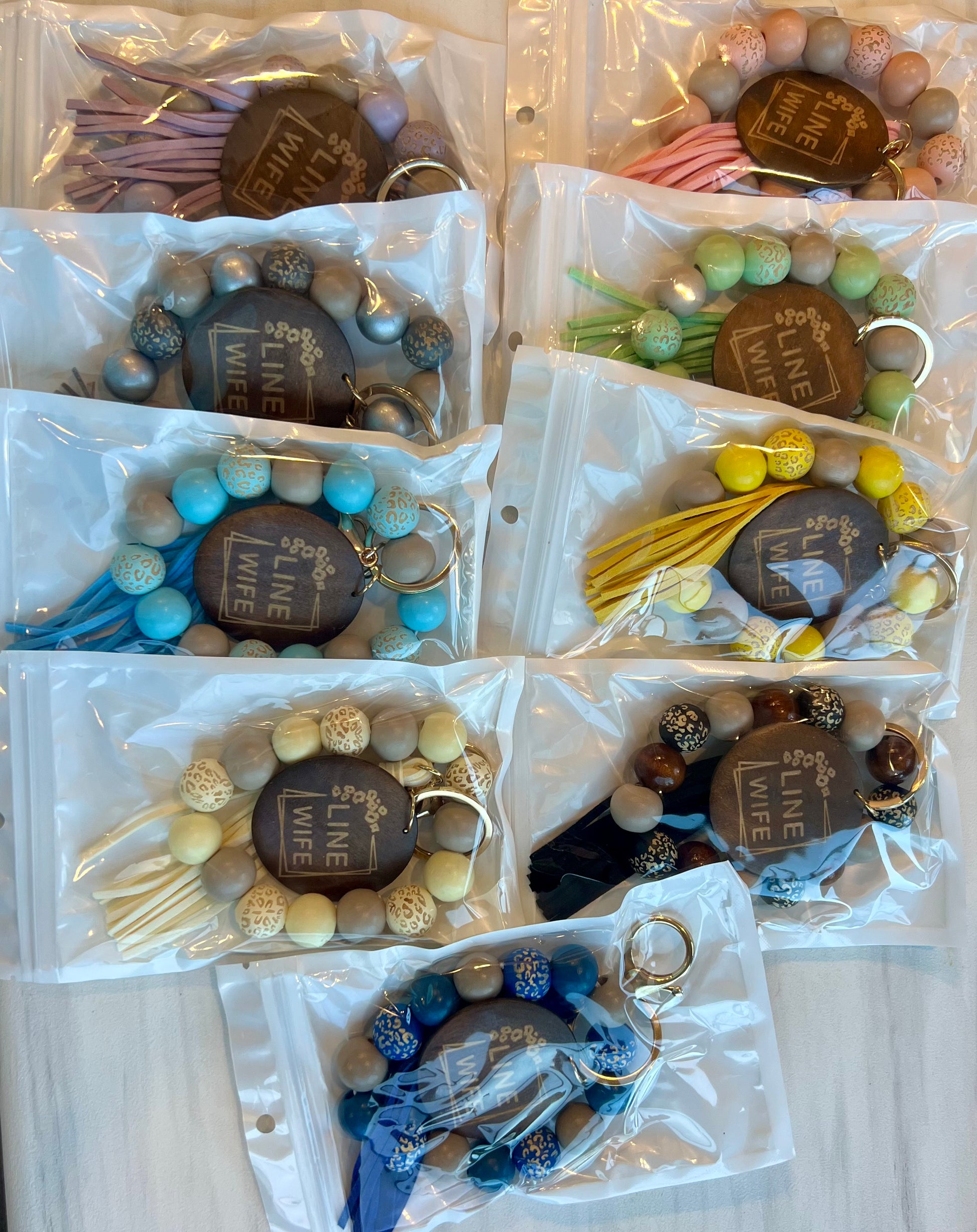 - Laser-engraved wooden “Linewife” charm